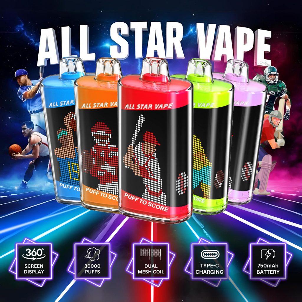 Welcome to All Star Vape, the groundbreaking innovation in the vaping industry! We proudly introduce the first-ever sports vape device, designed to uplift your vaping experience with a 360-degree display screen and unparalleled features. With a massive 30,000 puffs and a robust 750mAh battery, our device ensures long-lasting performance and satisfaction. Experience the next generation of vaping with our unique caller ID display, dual mesh coils for superior flavor, and Type-C charging for quick and convenient power-ups. Exclusively for adults aged 21 and over, All Star Vape offers an impressive 19ml e-liquid capacity with 5% nicotine, available in 10 refreshing flavors.